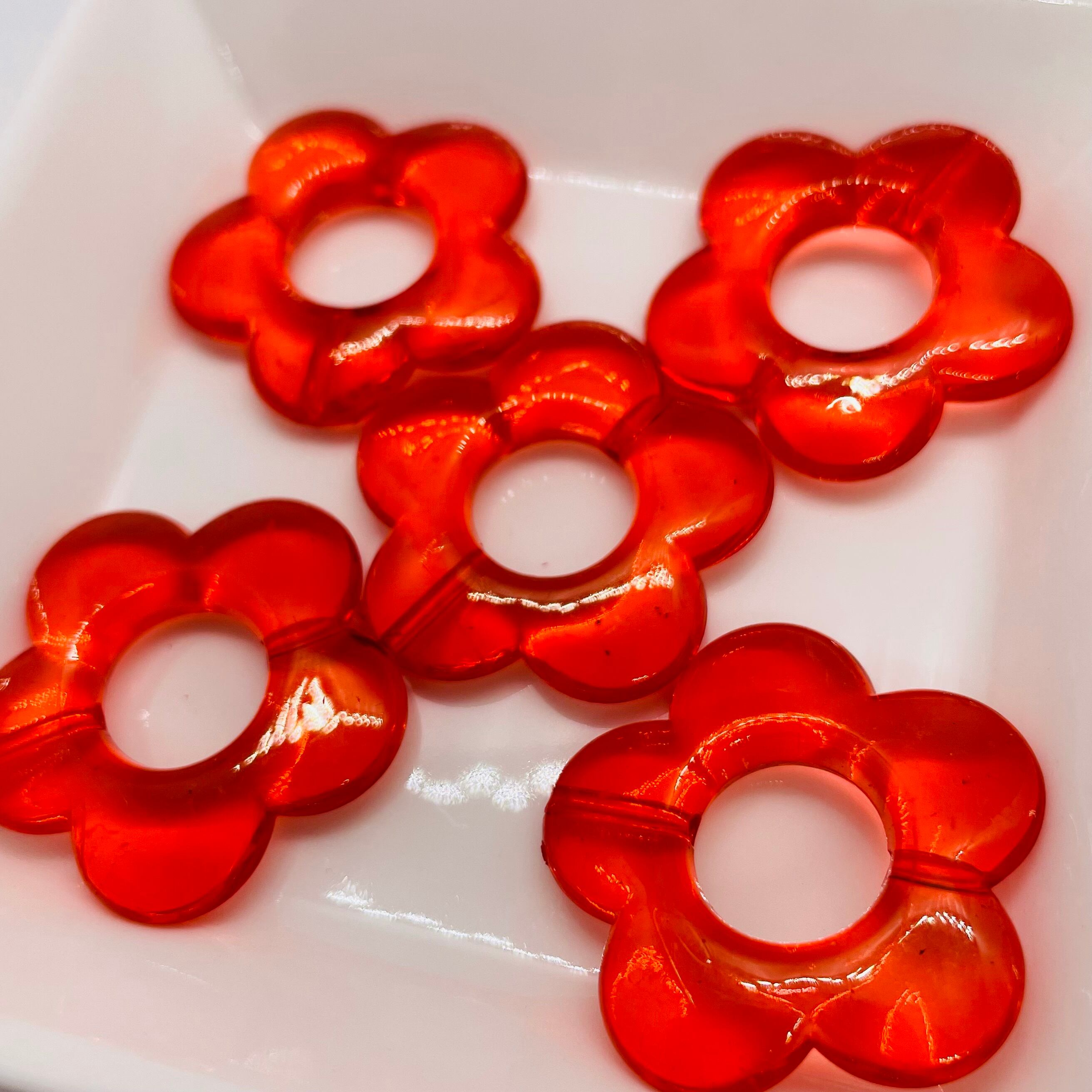 ぺたんこビーズ。真ん中のホール部分に6〜8mmサイズのお好きなカラーのラウンドビーズを入れることでオリジナルの大きめサイズのフラワービーズにすることができます。