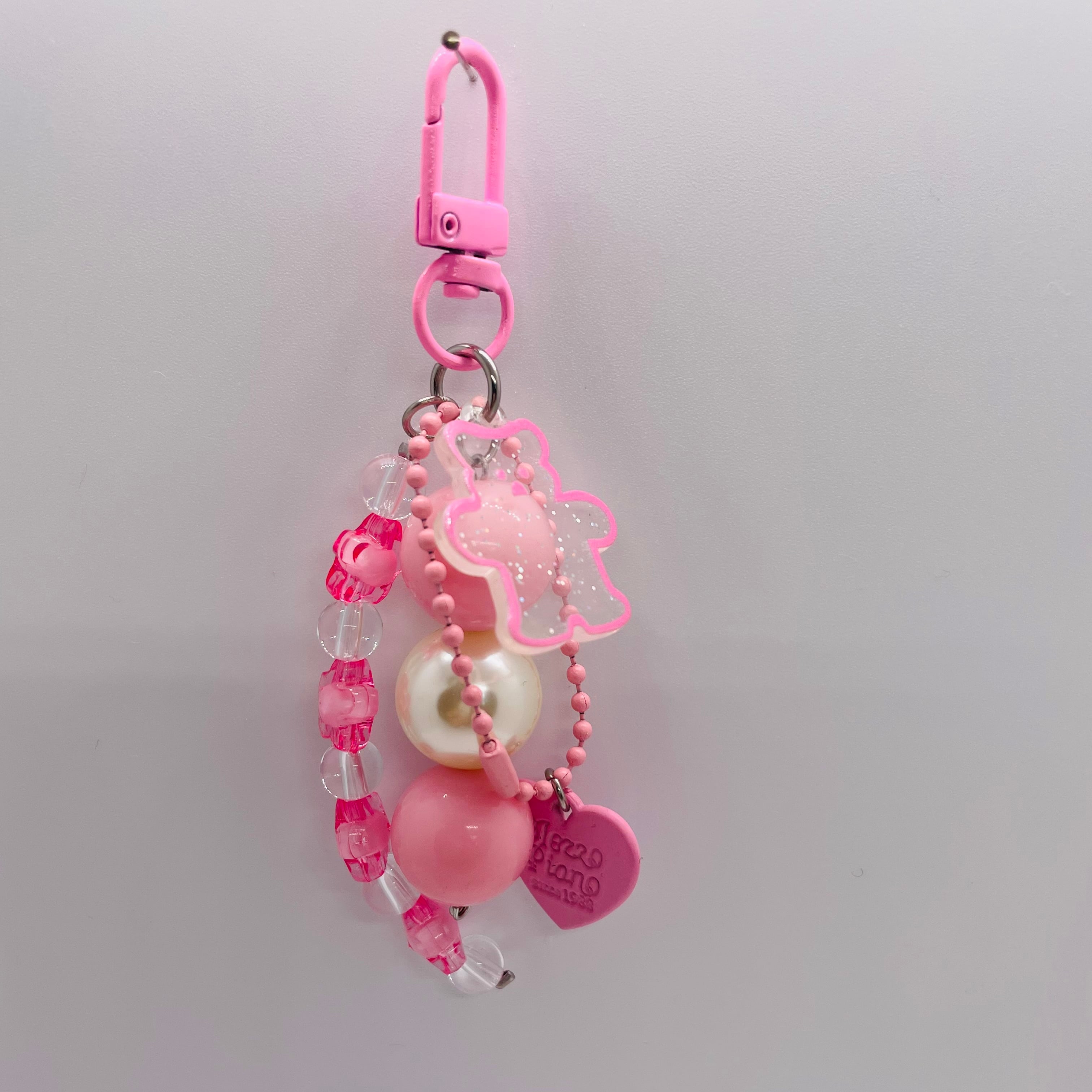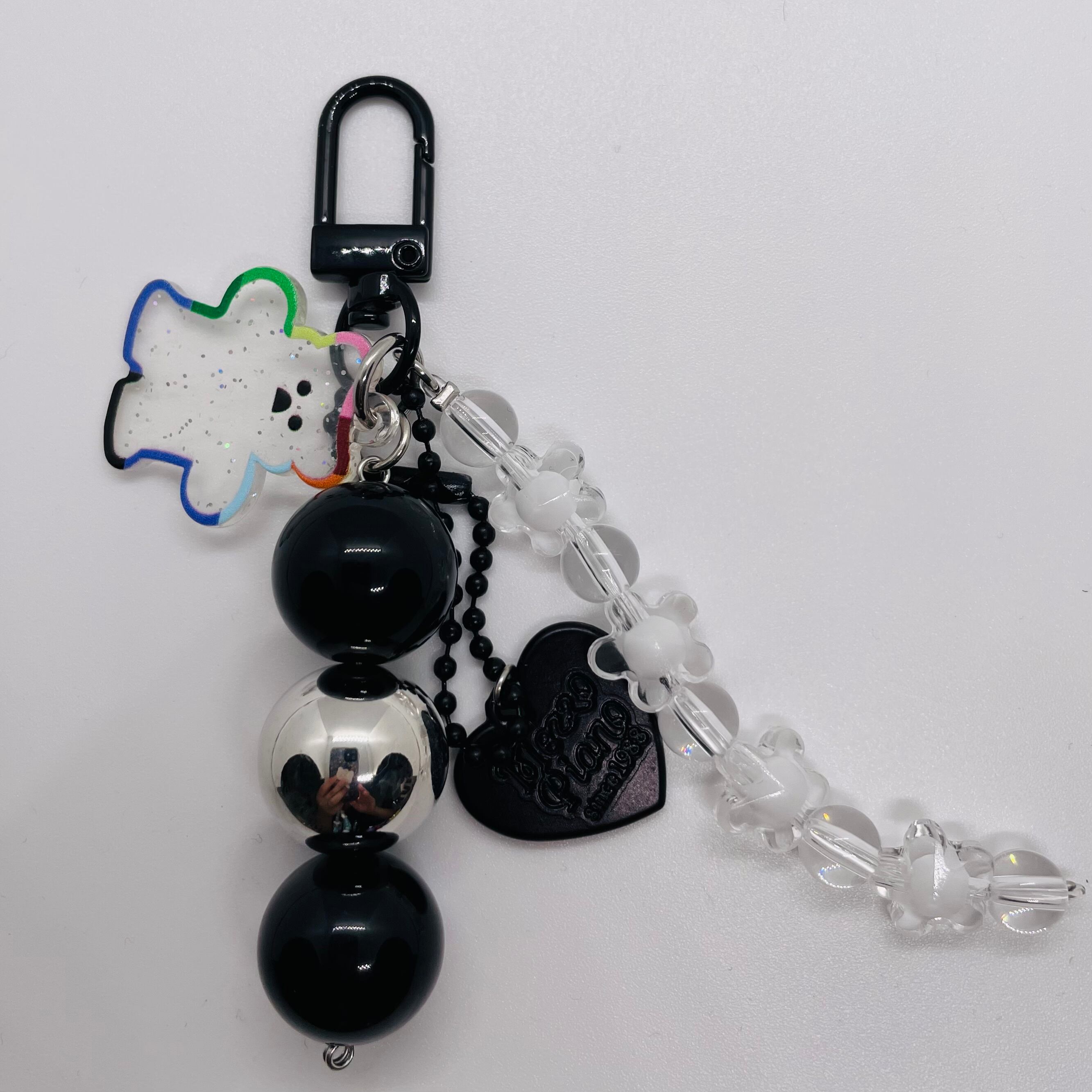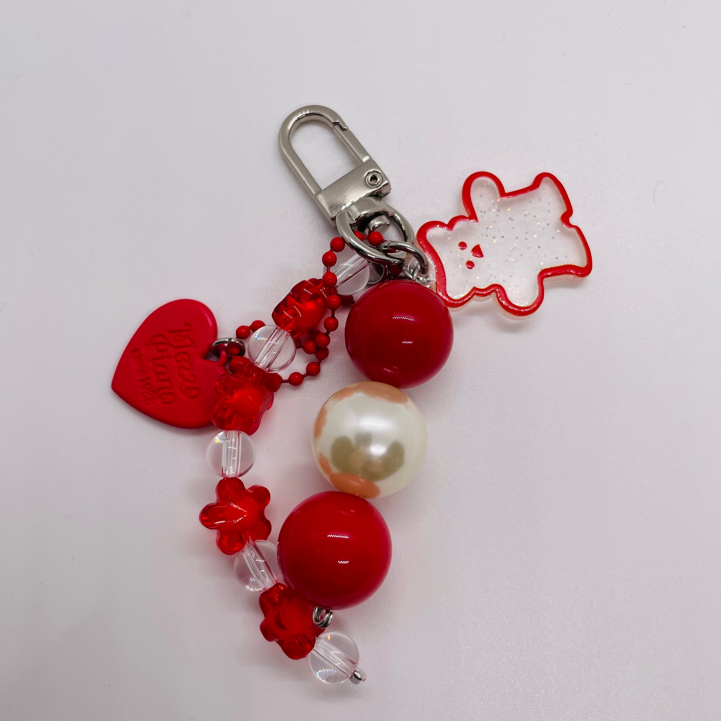 おとぼけ顔のくまのチャームがついたビーズキーホルダーです。